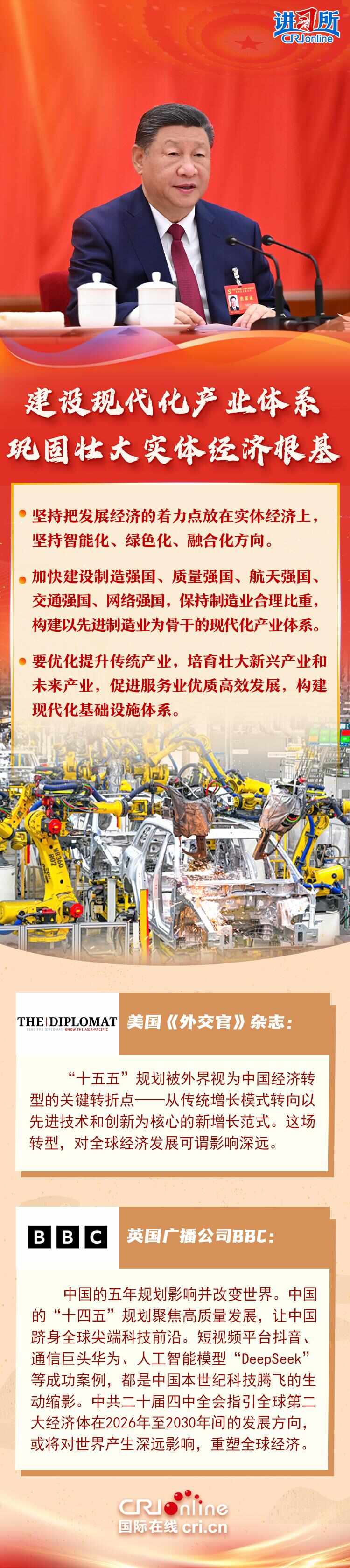 【本期简介】10月20日至23日,中国共产党第二十届中央委员会第四次全体会议在北京召开。全会听取和讨论了习近平总书记受中共中央政治局委托所作的报告,审议通过了《中共中央关于制定国民经济和社会发展第十五个五年规划的建议》,擘画了未来五年中国发展的新蓝图。 “实现社会主义现代化是一个不断发展、不断进步发展的历史过程。” “十五五”时期是我国全面实现社会主义现代化的关键时期,夯实基础,全力以赴。这次全会对我国扩大高水平开放、发展新生产力、未来五年建设美丽中国,向世界发出中国坚持开放合作、互利共赢的强烈信号。国际社会认为,中国“十四五”期间取得了一系列举世瞩目的成就。这些成就是本世纪中国出发的生动例证。中共二十届四中全会为中国未来五年的发展绘制了“蓝图”。这份“蓝图”已成为“承前启后的纽带”,将对世界产生深远影响,恢复全球经济。制片人:袁廷雷、戴爽、金金 策划:张千男 文案:楼可欣 编辑:任丽君 外联:胡晓伟 视觉:陈家杰 校对:魏书丽